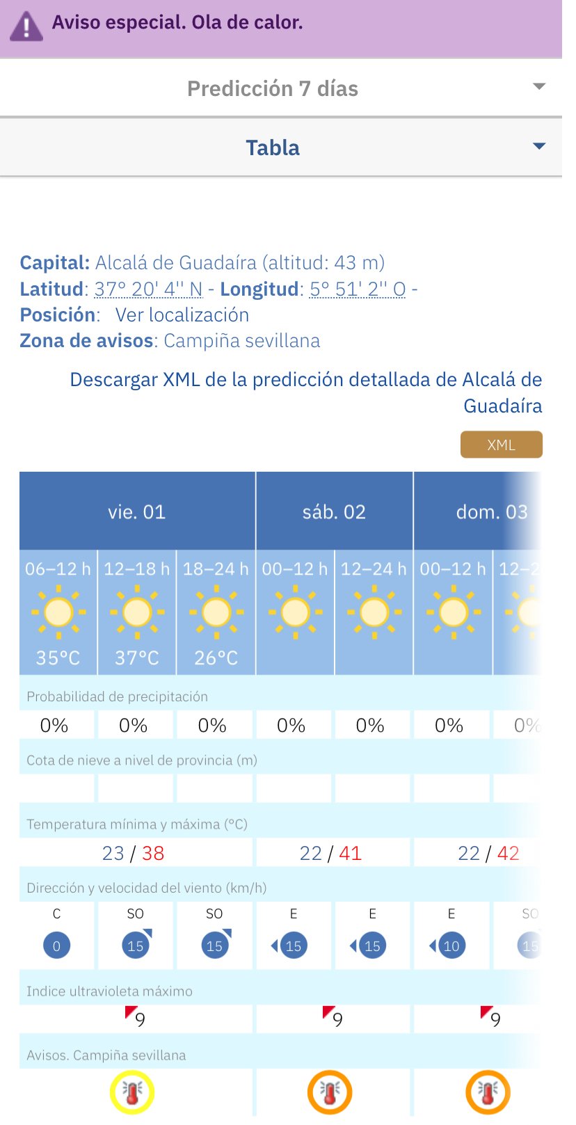 De momento, AEMET ha activado en Alcala el aviso naranja desde el sábado 2, cuando las temperaturas comenzarán alcanzar los 41 grados centígrados, en lo que será el preludio del episodio más intenso. No se descarta que, en los próximos días pueda elevarse el nivel de alerta a rojo en puntos del interior andaluz, si se confirman las previsiones de temperaturas superiores a los 43 grados en zonas como la campiña sevillana o el valle del Guadalquivir.