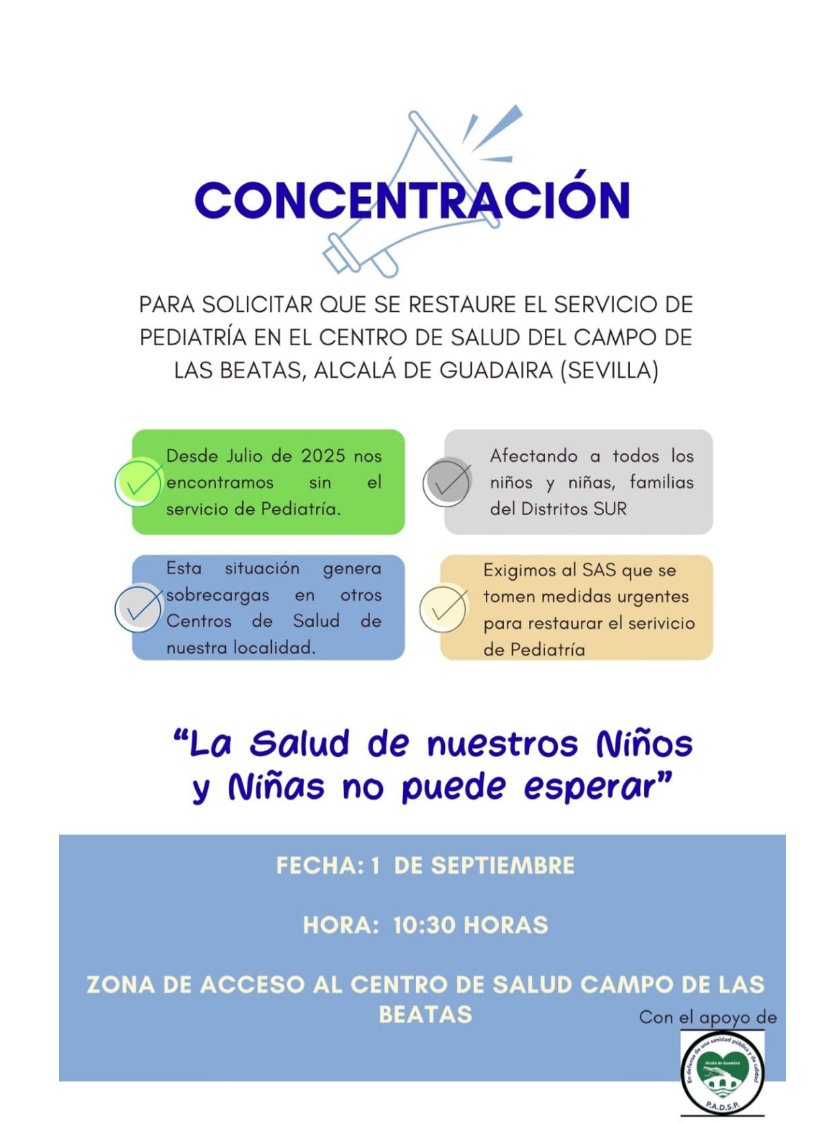 Y es que, como llevan dos meses denunciando, desde principios de este mes de julio, el Centro de Salud del Campo de las Beatas, en Alcalá de Guadaíra, se ha quedado sin pediatra. La situación ya encendió las alarmas entre las familias de la zona sur de la ciudad, que iniciaron una recogida de firmas para exigir la restitución inmediata de este servicio esencial. Hasta la fecha, han reunido más de 2.500 apoyos.