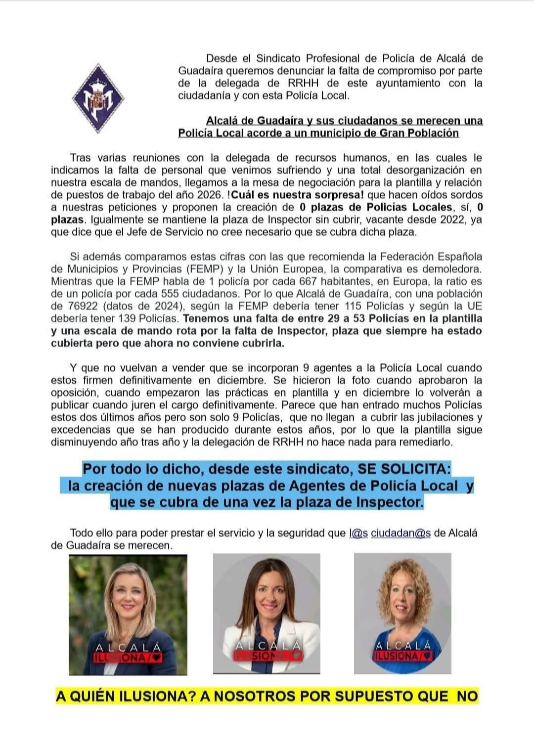 El Sindicato Profesional de Policía de Alcalá de Guadaíra ha denunciado públicamente la “falta de compromiso” de la delegada de Recursos Humanos del Ayuntamiento con la ciudadanía y con la propia Policía Local. Según el colectivo, la situación actual está muy lejos de lo que corresponde a un municipio de gran población como es Alcalá de Guadaíra.