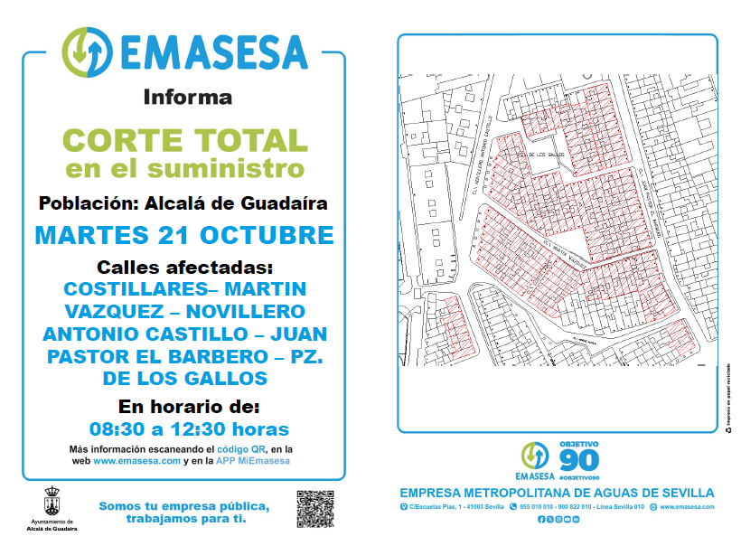 La Empresa Metropolitana de Aguas de Sevilla (EMASESA) ha anunciado un corte temporal en el suministro de agua que afectará a varias calles de Alcalá de Guadaíra el próximo martes 21 de octubre.