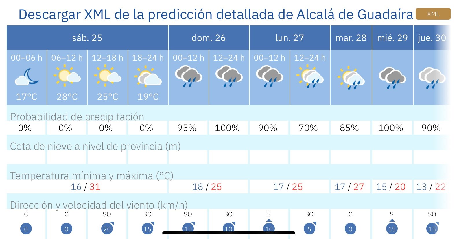 Según la Agencia Estatal de Meteorología (AEMET), las temperaturas máximas bajarán hasta situarse en torno a los 23 grados, dejando atrás el ambiente casi veraniego que ha acompañado a los alcalareños durante la última semana. Este domingo, las máximas rondarán los 25 grados, con una probabilidad del 100% de precipitaciones en las horas centrales del día.