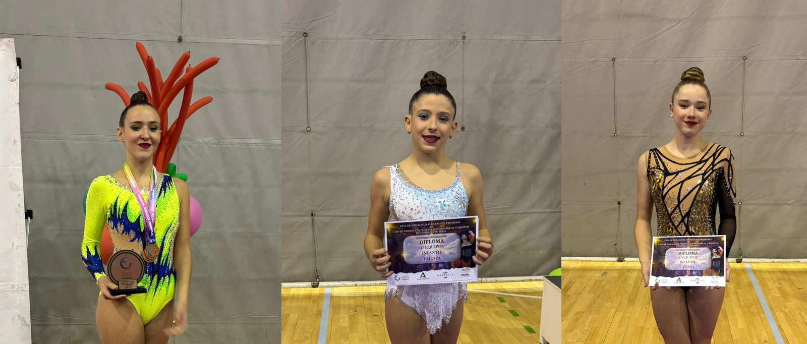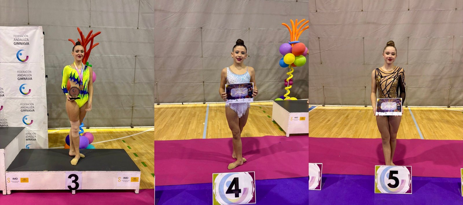 Magníficos resultados de la gimnasia rítmica en el Cto de Andalucía celebrado en Sevilla. Uniéndose al éxito de Paola Muñoz, quien realizó un maravilloso ejercicio, también obtuvieron muy buenas clasificaciones otras tres gimnastas: