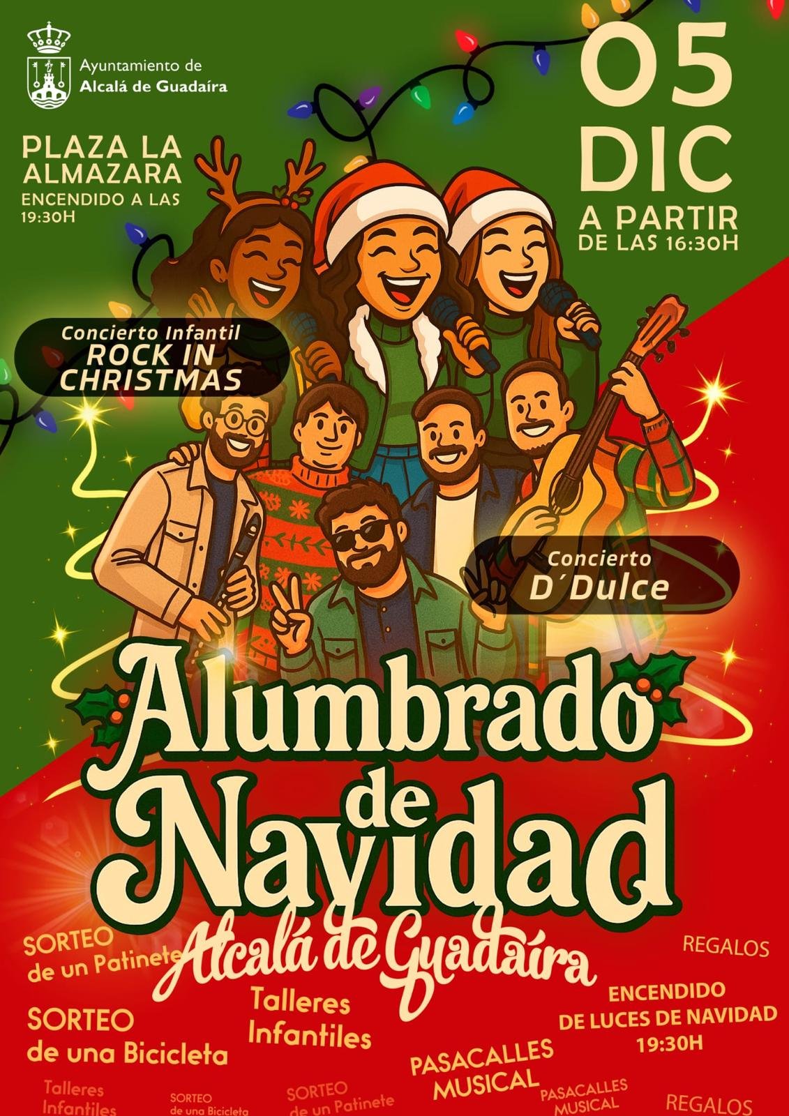 Alcalá de Guadaíra da la bienvenida a la Navidad el próximo viernes día 5 de diciembre con el encendido del alumbrado extraordinario que, cuenta arcos y motivos en viarios, paseos y rotondas de los cuatro distritos, con especial presencia en las zonas comerciales, y una Fiesta en la Plaza de la Almazara. Habrá talleres, lluvia de confeti, personajes, regalos, sorteos y música en directo a partir de las 16:30 horas. También habrá un pasacalles musical a cargo de la Banda del Cristo de la Bondad con salida a las 18:00 horas desde La Plazuela y llegada a la Plaza de la Almazara a las 19.15 horas.