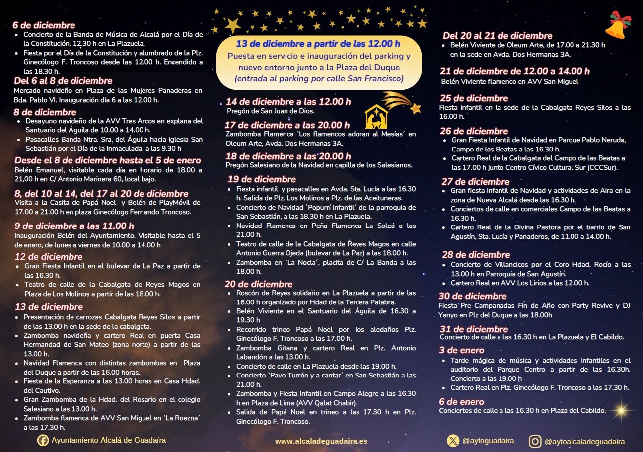 Igualmente, ha señalado que serán días de descanso y festivos en los que hay programadas numerosas actividades en todos los barrios y espacios de la ciudad que se podrán consultar en un tríptico especial, así como en la Agenda de Alcalá y la web municipal www.alcaladeguadaira.es