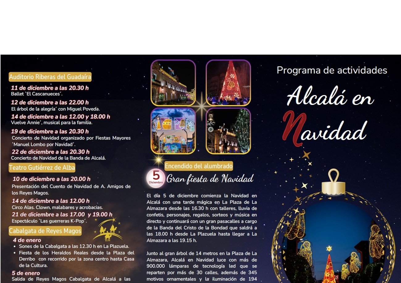 El encendido tendrá lugar a las 19:30 horas y tiene como motivo central el gran árbol de Navidad de 14 metros de altura, e iluminado con 30.000 lámparas, y rematado por una gran estrella, que está instalado en la Plaza de la Almazara. Con el árbol, se iluminarán arcos y motivos instalados en viarios, paseos y rotondas a lo largo de los cuatro distritos de la ciudad, con especial presencia en las áreas comerciales de los barrios alcalareños.