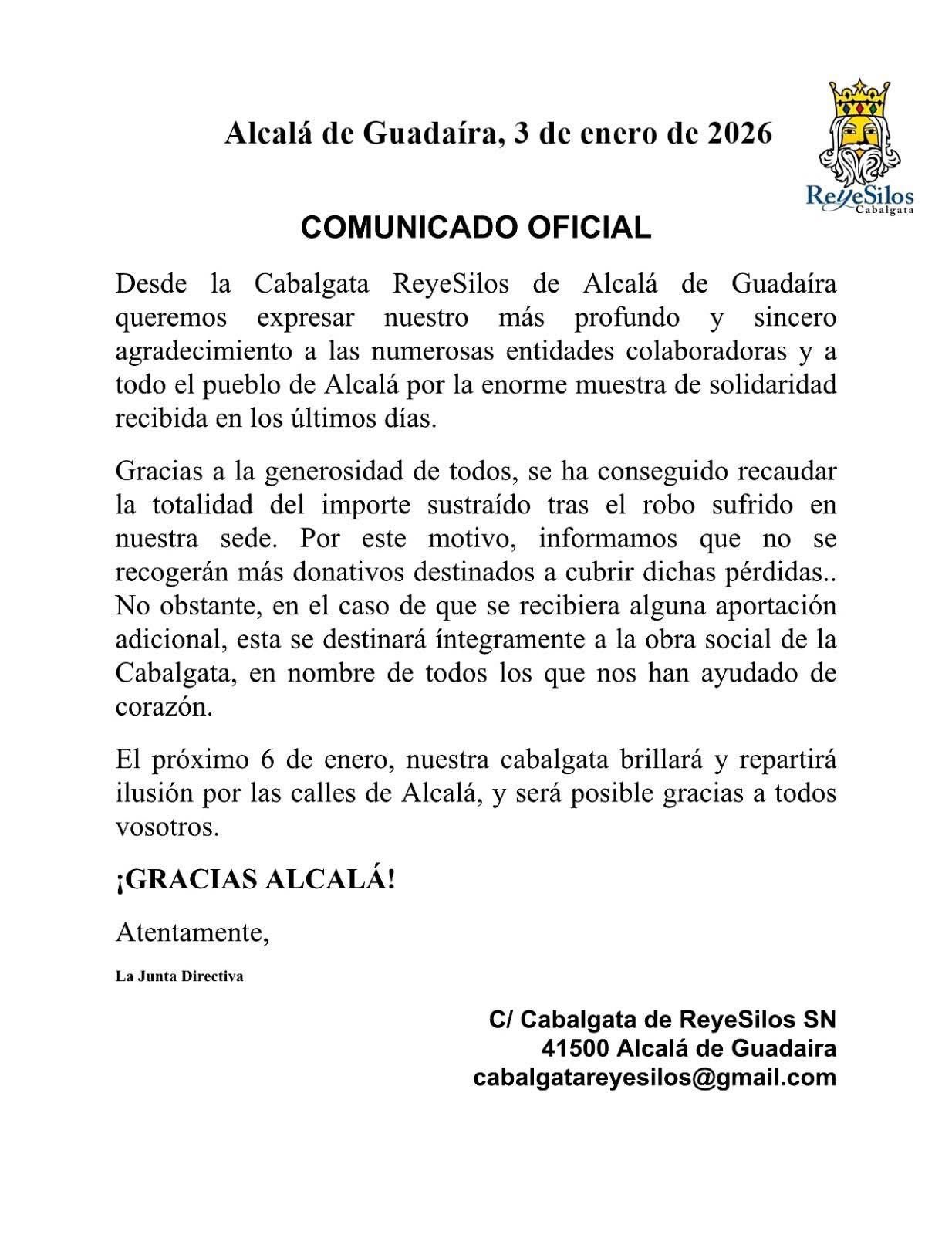 Así lo ha confirmado la organización de la Cabalgata Reye Silos en un comunicado oficial emitido este 3 de enero, en el que la Junta Directiva expresa su “más profundo y sincero agradecimiento” a todo el pueblo de Alcalá por la enorme muestra de apoyo recibida. Un respaldo que ha ido mucho más allá de lo económico y que ha servido para reforzar el espíritu de comunidad en uno de los momentos más especiales del año.