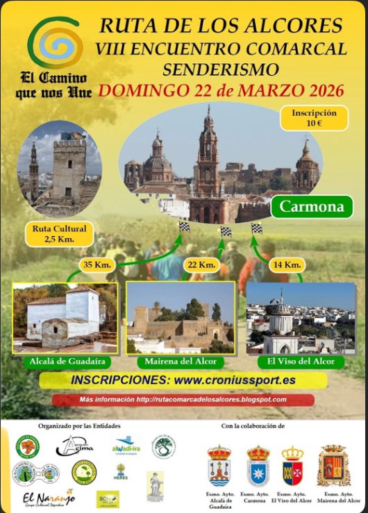 Ya está abierto el plazo de inscripción a la VIII Ruta de los Alcores ‘El camino que nos une’. Una jornada de convivencia y senderismo entre los cuatro municipios de la comarca, Alcalá de Guadaíra, Mairena del Alcor, El Viso del Alcor y Carmona, con el objetivo de poner en valor el patrimonio histórico, natural y paisajístico de Los Alcores. La inscripción online ya está disponible en la web croniussport