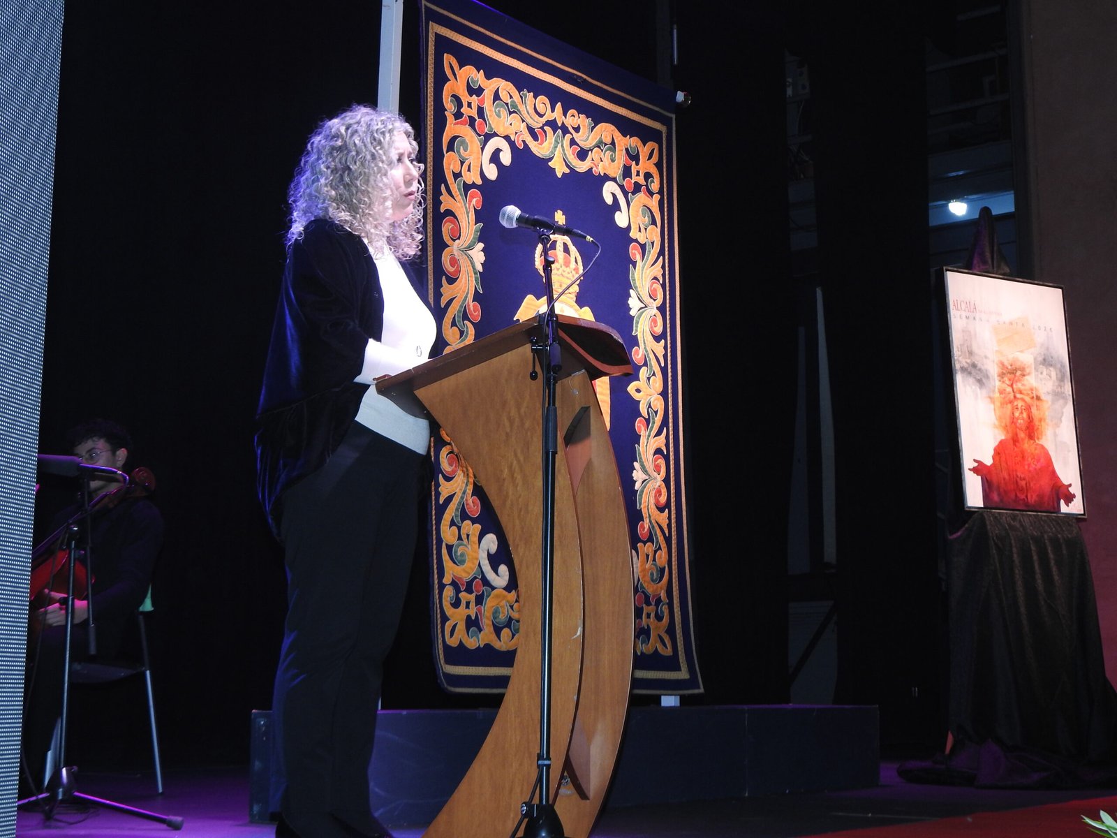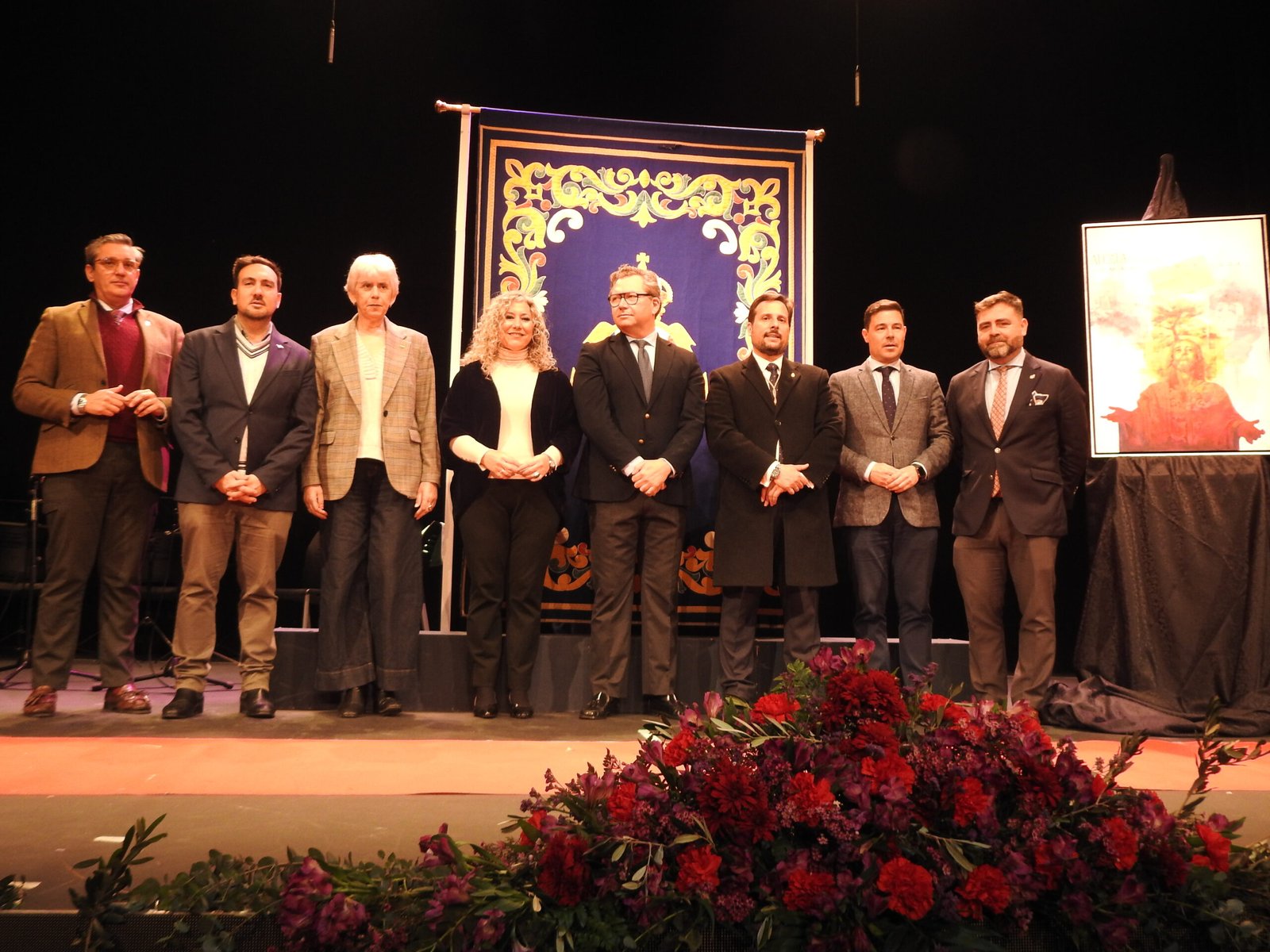 Durante su intervención, Martín Mena desgranó el significado de su cartel, concebido como «una oración visual en la que Alcalá se transforma simbólicamente en Getsemaní». En el centro de la composición, una ciudad que se abre a la plegaria; al fondo, elementos identitarios del municipio como el castillo, los molinos, el albero y el blanco de la cal, todos integrados en una atmósfera cargada de espiritualidad. Siempre presente, aunque en segundo plano, la sombra de la Virgen acompaña a Jesús, reforzando esa idea de protección constante y silenciosa.