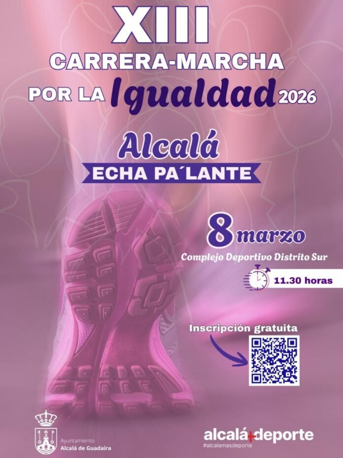 El Ayuntamiento de Alcalá de Guadaíra, a través de las delegaciones de Deportes e Igualdad, prepara la XIII Carrera-Marcha por la Igualdad que, en este 2026 con el lema ‘Alcalá echa pa’lante’, se celebrará el domingo 8 de marzo dentro de las actividades conmemorativas que a lo largo del mes se desarrollarán en la ciudad con motivo del Día Internacional de la Mujer (8 M), fecha emblemática para la lucha y el avance de los derechos de las mujeres.