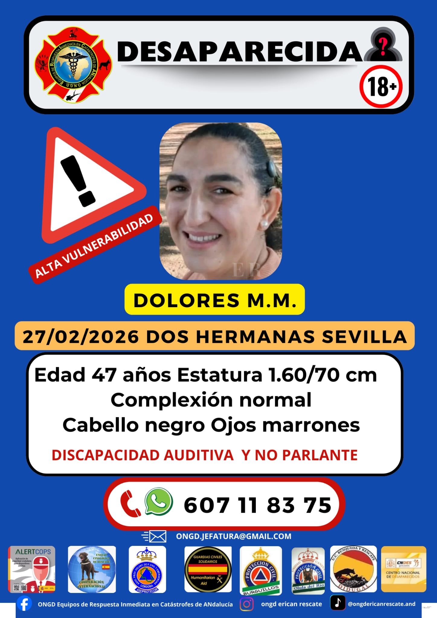 La localidad vecina de Dos Hermanas mantiene activa la búsqueda de Dolores M.M., desaparecida este 27 de febrero de 2026.