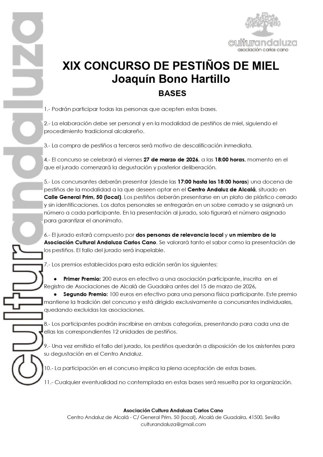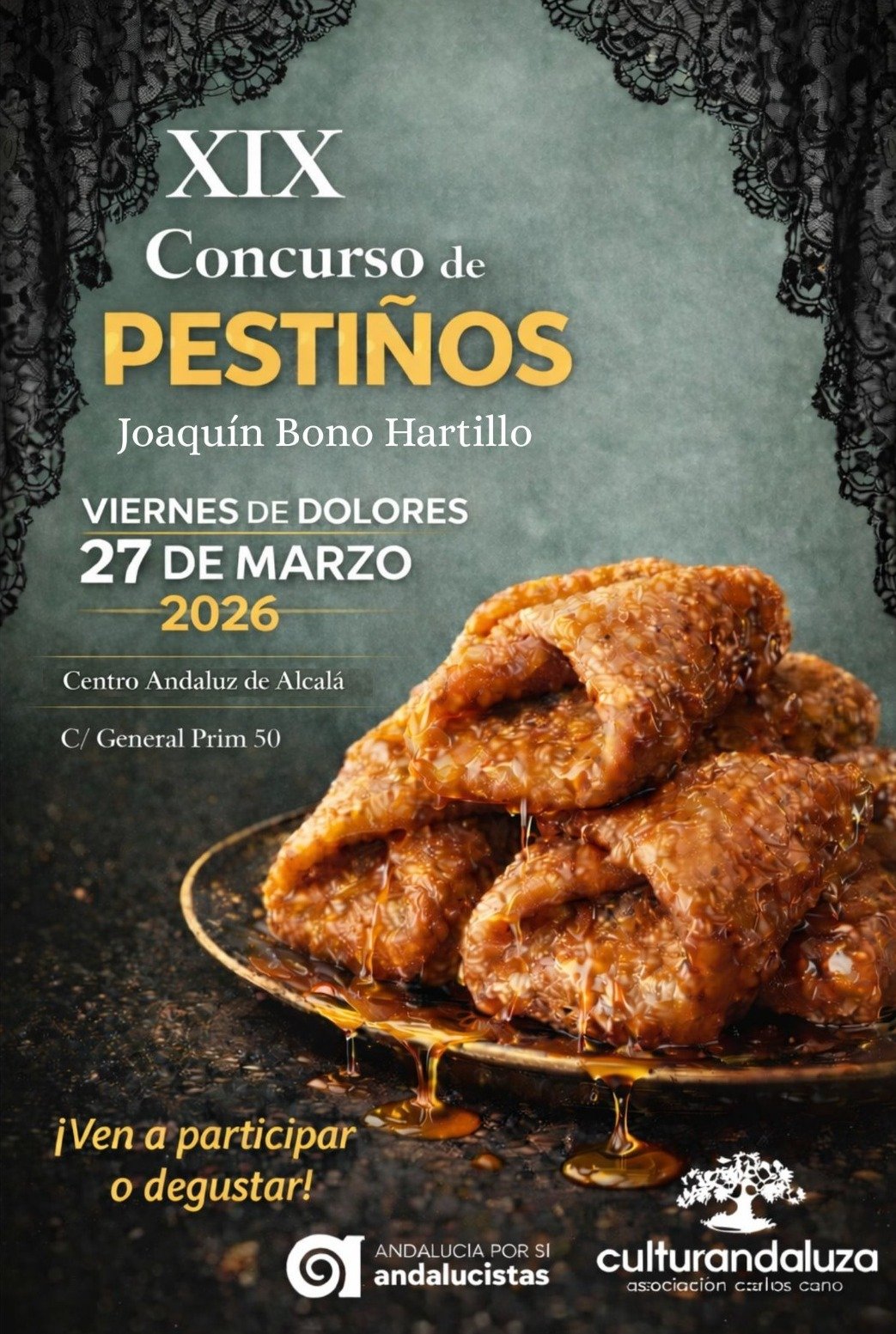 La ciudad celebrará la XIX edición del Concurso de Pestiños de Miel ‘Joaquín Bono Hartillo’, organizado por la Asociación Cultural Carlos Cano de Alcalá, en una cita que se ha convertido ya en todo un clásico de la antesala de la Semana Santa alcalareña.