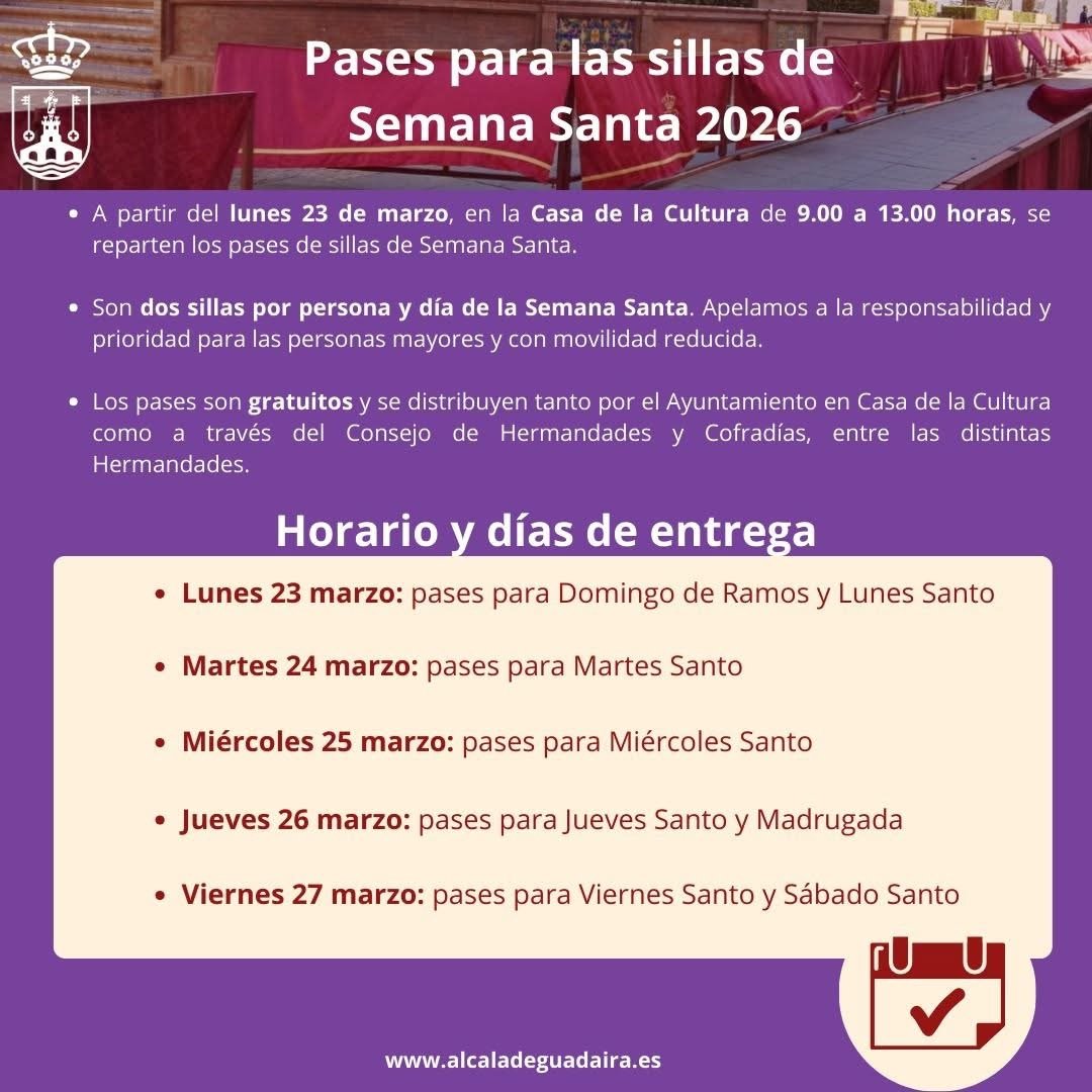 👉 Los pases son gratuitos y se entregarán con un máximo de dos sillas por persona y día de Semana Santa.