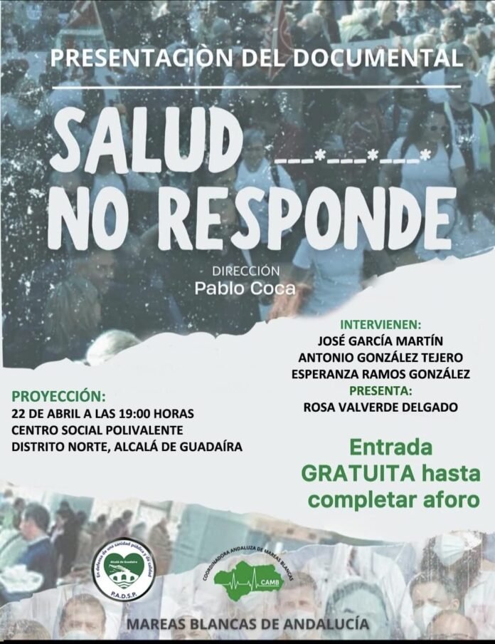 Alcalá de Guadaíra acogerá este miércoles 22 de abril la proyección del documental «Salud no responde». Se trata de una obra centrada en la situación actual de la sanidad pública y los desafíos a los que se enfrenta el sistema sanitario. El acto tendrá lugar a las 19:00 horas en el Centro Social Polivalente del Distrito Norte, con entrada gratuita hasta completar aforo.